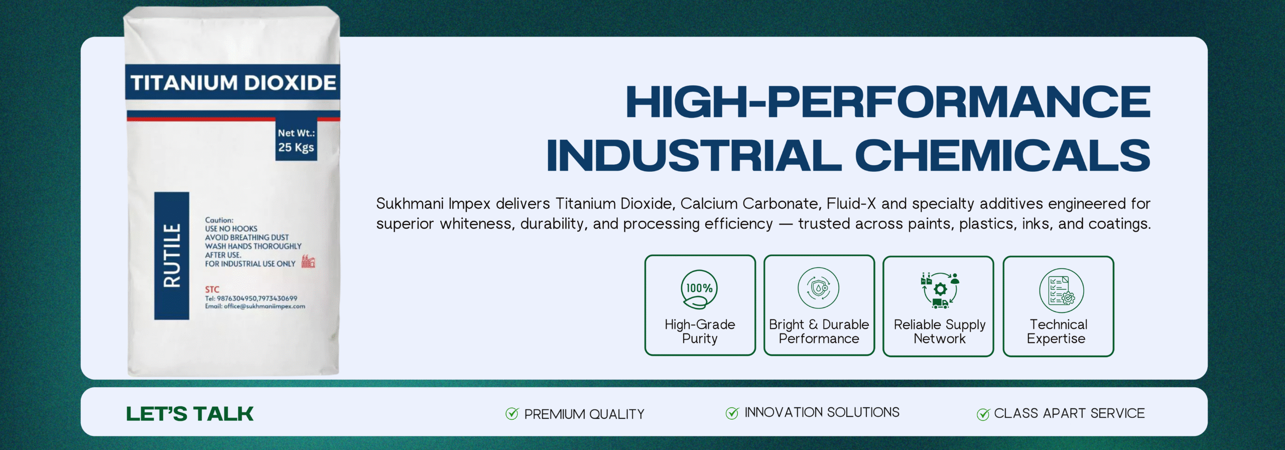 At Sukhmani Impex, we focus on building lasting partnerships by providing titanium dioxide that performs precisely and consistently. Our extensive industry knowledge and commitment to quality have made us a preferred supplier for manufacturers in coatings, plastics, paper, and other performance-driven sectors.Through ongoing improvement and effective production methods, we improve the purity, brightness, and efficiency of our TiO₂ grades while minimizing environmental impact. Our research-led approach ensures that every product contributes to longer-lasting, more sustainable end applications.Each batch we send out is carefully inspected by our Quality Assurance Guardians, a dedicated team making sure every shipment meets the highest standards for performance, safety, and uniformity. Only materials that meet our specifications reach our clients.